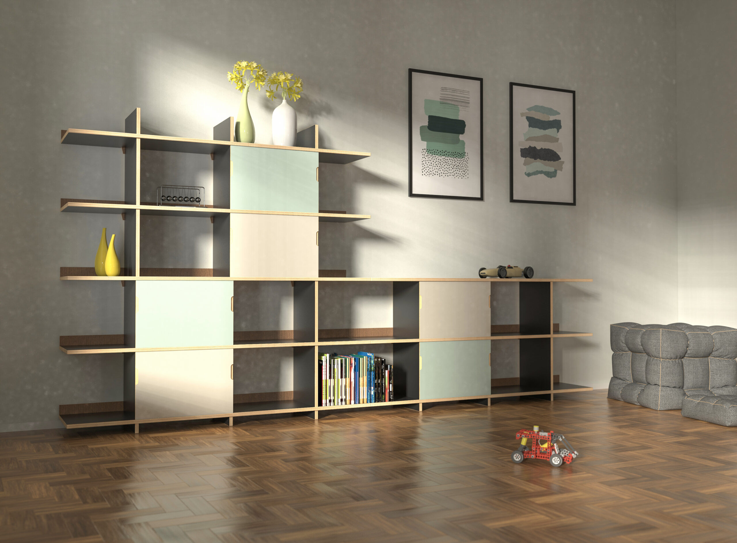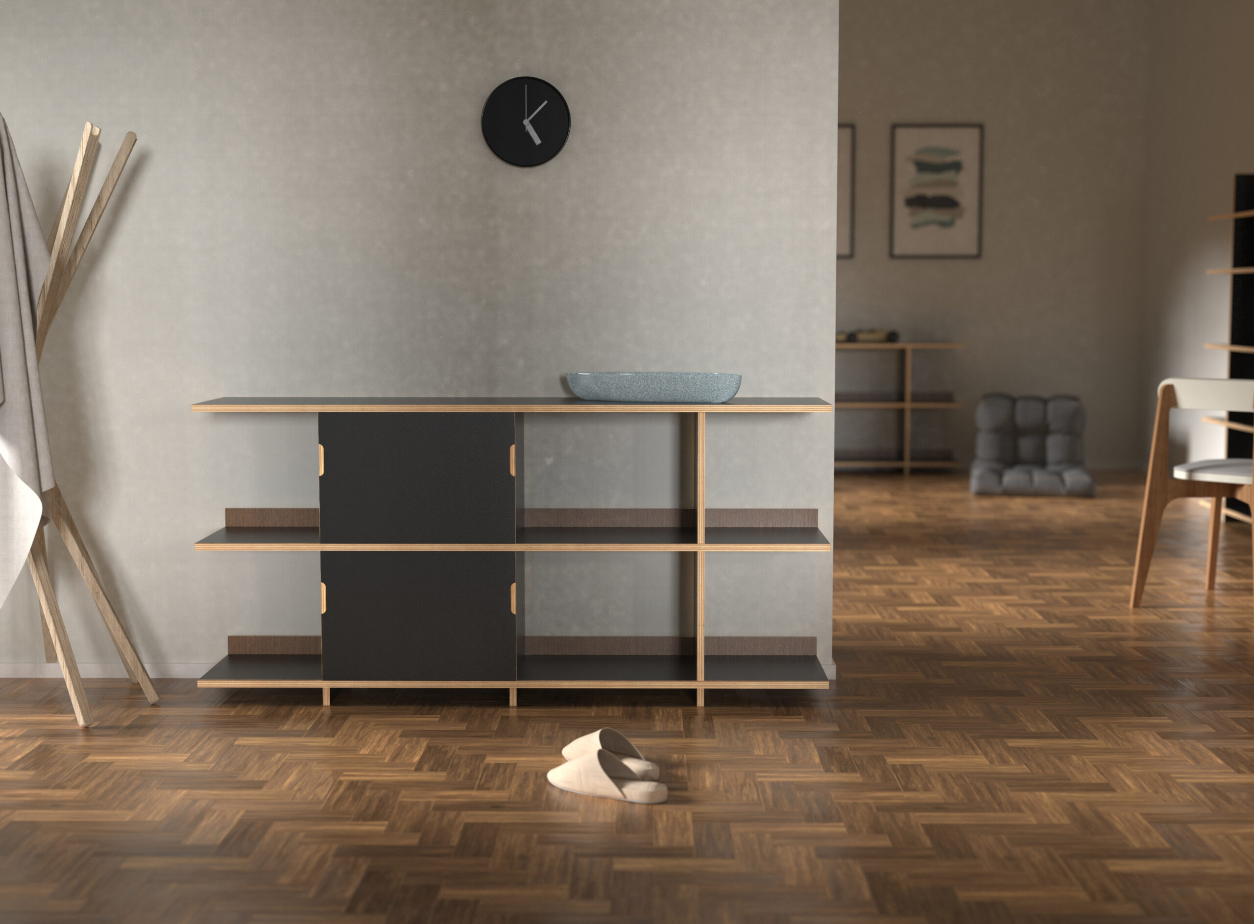 „FlatMade“ is a shelving system that enriches the living experience with its clear yet understated presence. It was designed for people with a sense of tradition, culture, minimalism and materiality. What makes living more pleasant than the right FlatMade? The system is designed for tool-free assembly and consists exclusively of panel material, which is connected to form a small to large grid using plug-in connections. Multiplex boards (coated) are the ideal material.